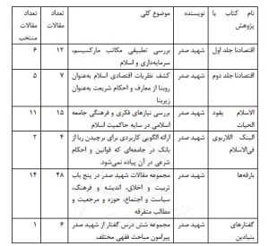 در روش فراترکیب مقالات بر اساس بررسی چکیده، بررسی محتوا، بررسی کیفیت مقاله غربال می- شوند. برای این منظور درمجموع ٩٢ پژوهش و مقاله از شهید صدر بررسی گردید که با مطالعه و غربال گری این پژوهشها از نظر عنوان، چکیده و محتوا، تعداد ٣٩ مقاله انتخاب گردید که برای دستیابی به نتیجه، موردبررسی دقیق تر قرار گرفت و نتایج پس از تلفیق گزارش گردید. نتایج این فرآیند در چهار حیطه و ١٠ مقوله اصلی دسته بندی گردید. در جدول زیر کتب شهید صدر و تعداد مقالات منتخب از هر کتاب ذکر شده است.