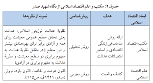 در بیان شهید صدر آن گونه که در جدول ۱ منعکس شده است مکتب اقتصادی اسلام دارای چند مؤلفه محوری است: الف) روشی برای ساماندهی زندگی اقتصادی و حل مشکلات اقتصادی است؛ ب) شیوه ای برای تغییر واقعیت فاسد اقتصادی است؛ (ج) اقدامی عملیاتی و اجرایی است؛ د رویکردی ارزشی دارد و روش مزبور را بر اساس ارزش عدالت ارائه میدهد؛ (ه) این روش مورد پذیرش اسلام است؛ و روش مزبور توسط جامعه اسلامی پذیرفته شده است.